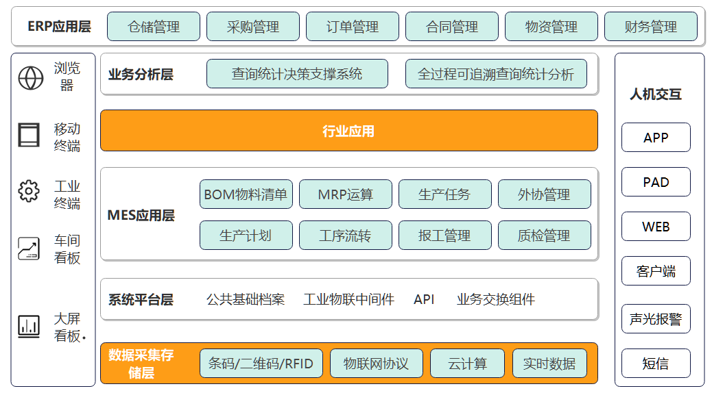 在企业内部纵向贯通生产计划、生产执行、生产设备物联,横向拉通研产供销财业务环节,实时采集现场生产数据,形成以制造为核心的、数据驱动的,销售、计划、研发、采购、仓储、物流、车间、设备、成本全流程业务闭环的一体化生产运营管控能力。